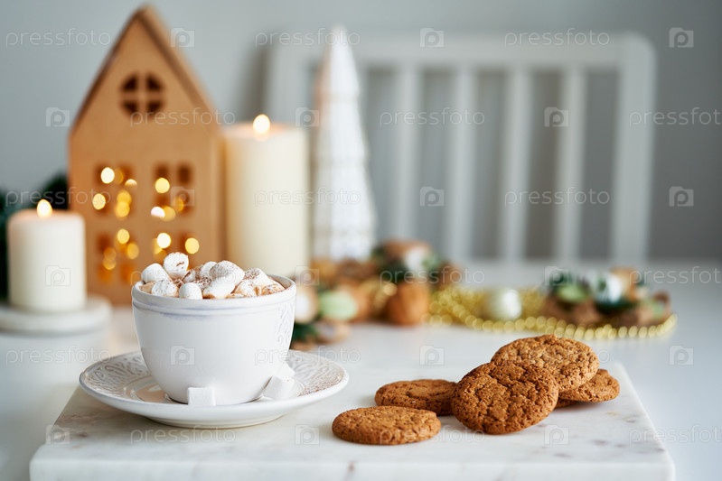 Рождественская атмосфера в гостиной, праздничный дом. Домашнее печенье с чипсами и чашка горячего шоколада
