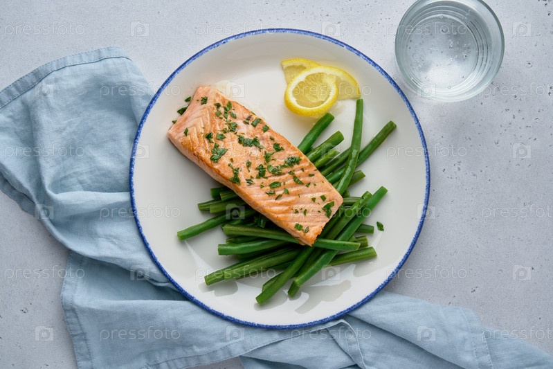 Запеченное филе лосося со спаржей, лимоном, петрушкой и стаканом воды. Пескетарианский обед