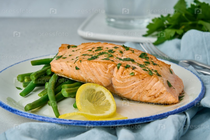 Вкусный запеченный лосось со спаржей, лимоном и петрушкой. Здоровая пища с омега3