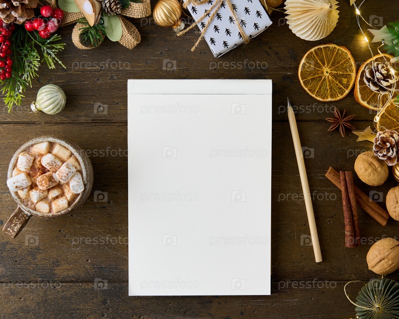 Составление новогоднего списка желаний в блокноте. Делать заметки о рождественских подарках. Рождественские украшения. Деревянный фон. Горячий какао-напиток с зефиром и тертым шоколадом