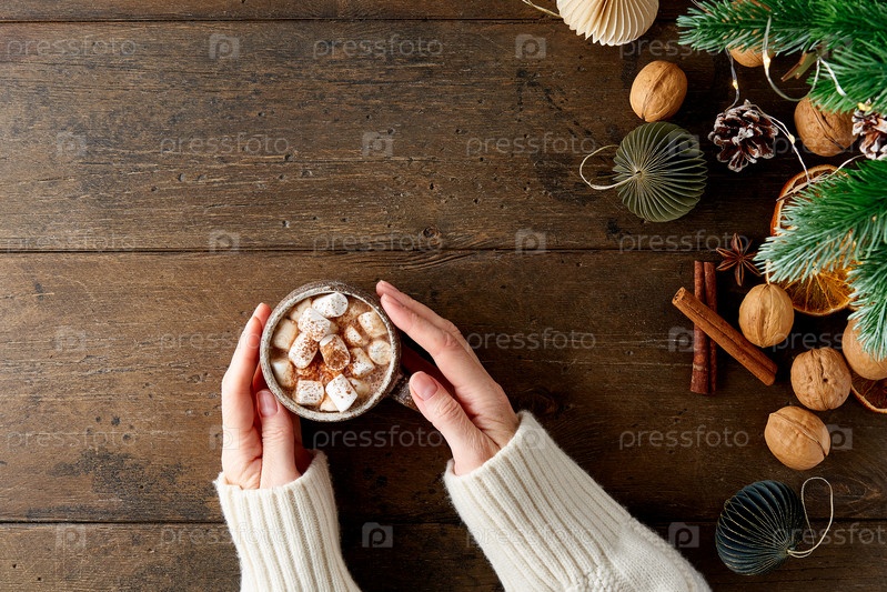 Безликая женщина держит чашку горячего шоколада с зефиром. рождественские украшения