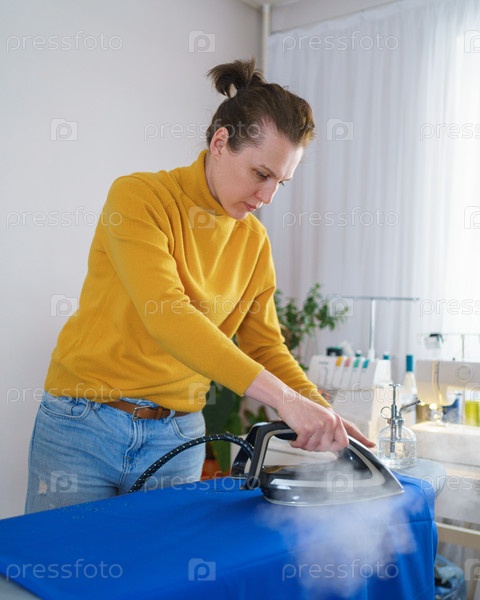 Женщина-швея гладит оранжевую ткань во время работы на своем рабочем месте