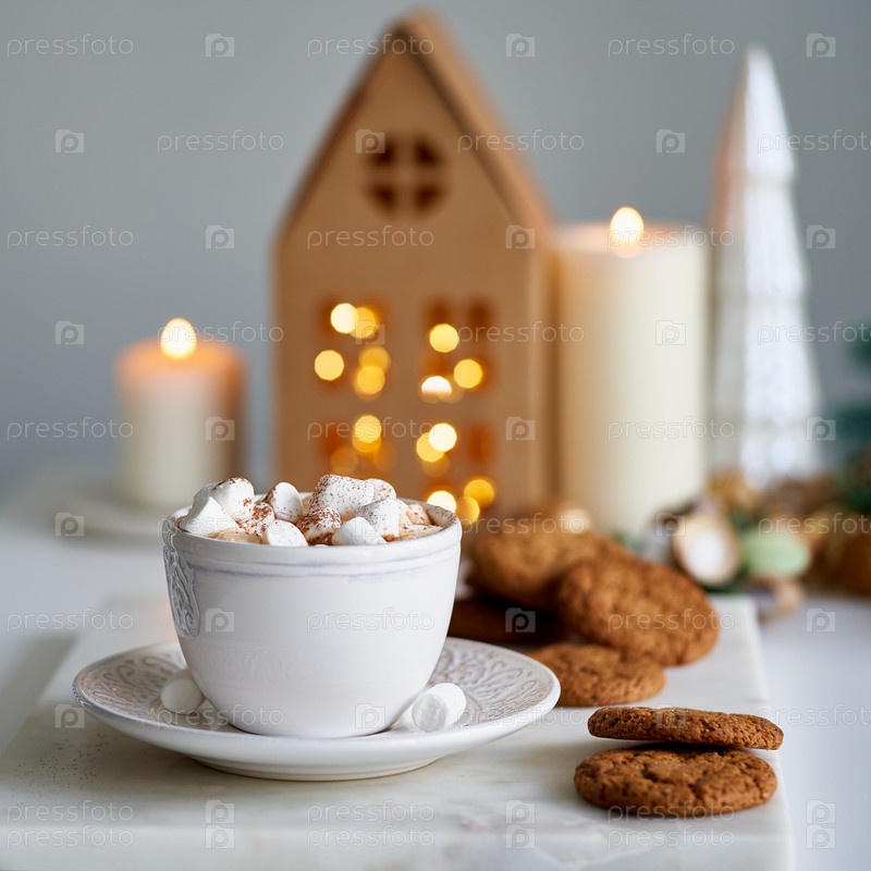 Уютная домашняя новогодняя атмосфера, праздничное праздничное настроение. Светло-серый фон. Домашнее печенье с чипсами