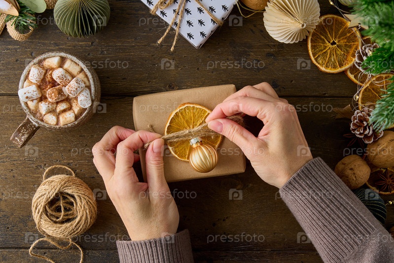 Безликая женщина завязывает узел шпагата на рождественском подарке на деревянном столе. шары на новый год