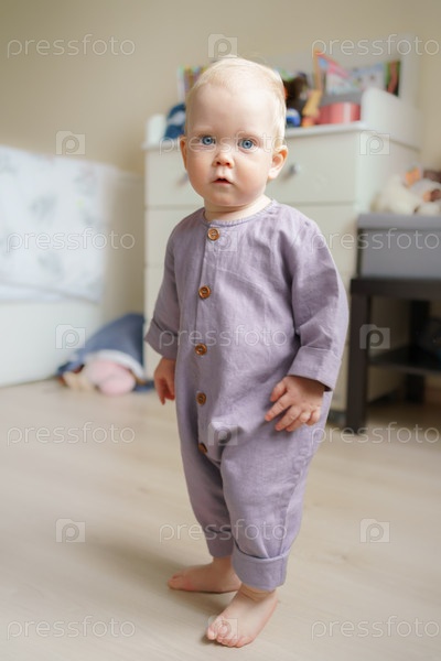 Очаровательный маленький ребенок смотрит в камеру, стоя в детской комнате