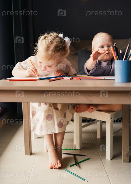 Двое детей, сестра и маленький брат, рисуют карандашами вместе дома