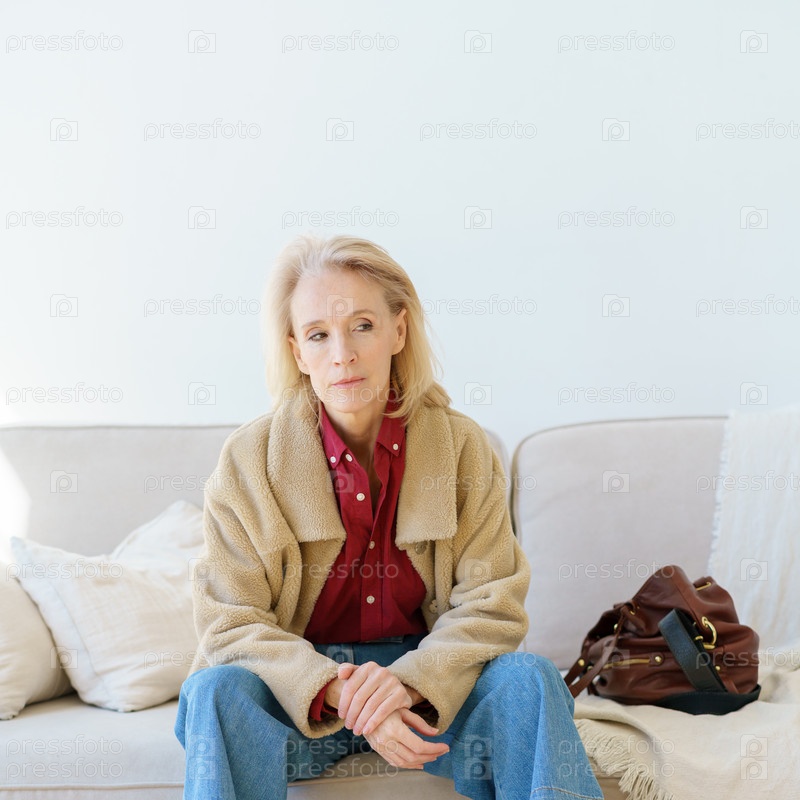 Уставшая пожилая женщина смотрит в сторону, отдыхая дома на диване после тяжелого рабочего дня