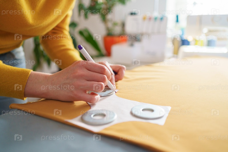 Женщина-швея делает выкройку, работая на своем творческом рабочем месте