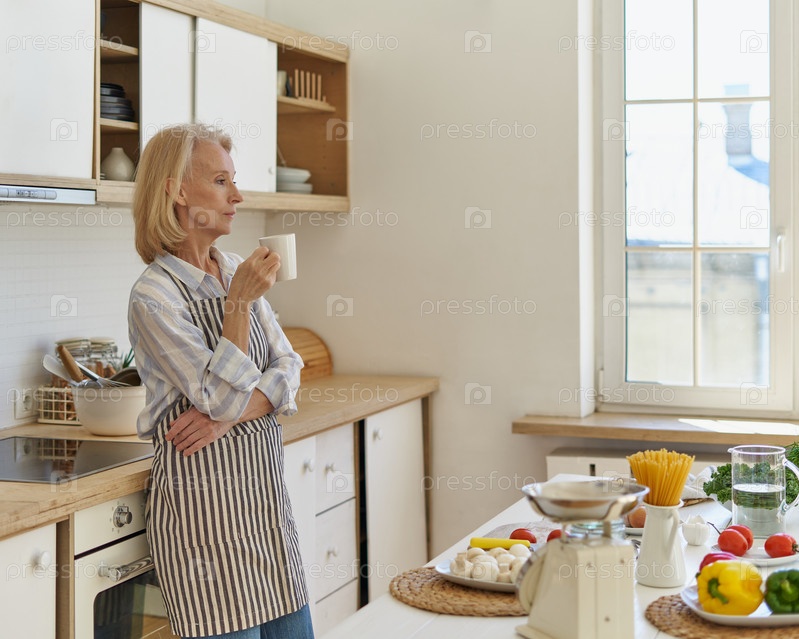 Вдумчивая пожилая женщина начинает новый день с кофе, стоя дома на кухне