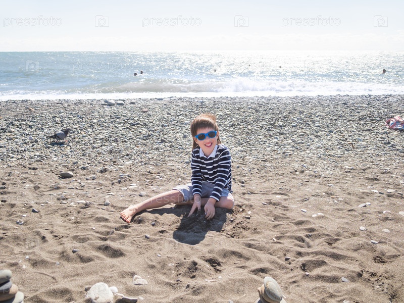 Счастливый мальчик строит пирамиду из мокрого песка, камней и коряги на галечном пляже. Отдых на море. Изучение природы в детстве