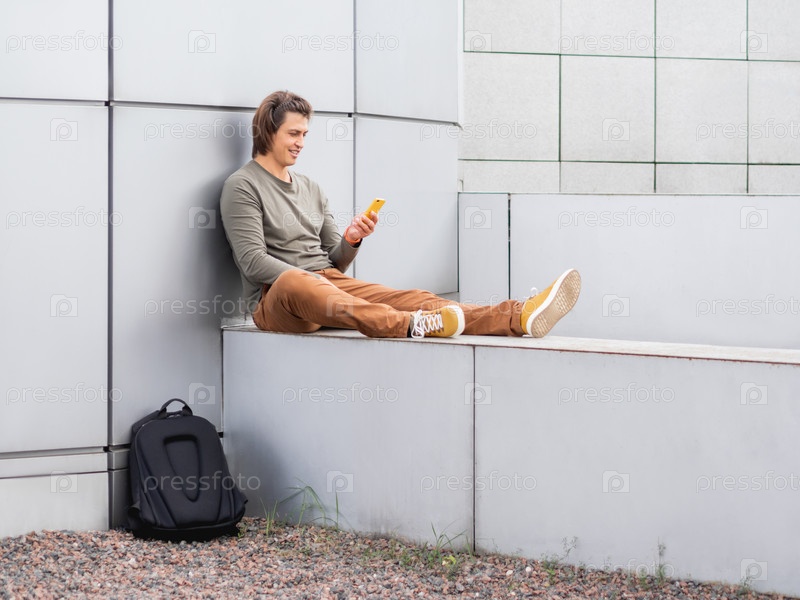 Молодой человек сидит со смартфоном на наружной части стены. Студент с рюкзаком в обычной одежде. Красивый мужчина с длинными волосами. Современный городской образ жизни