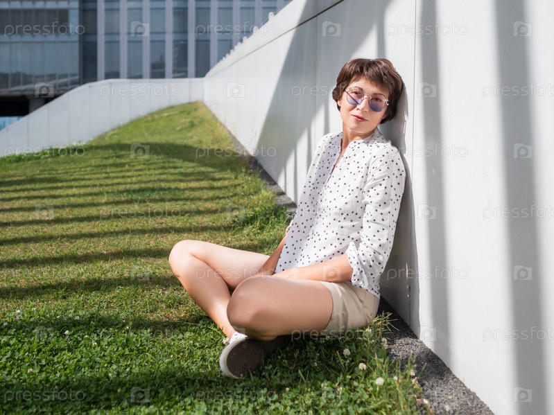 Улыбающаяся женщина в красочных солнцезащитных очках отдыхает на лужайке в городском парке. Природа в городе. Отдохните на свежем воздухе после работы. Летние вибрации