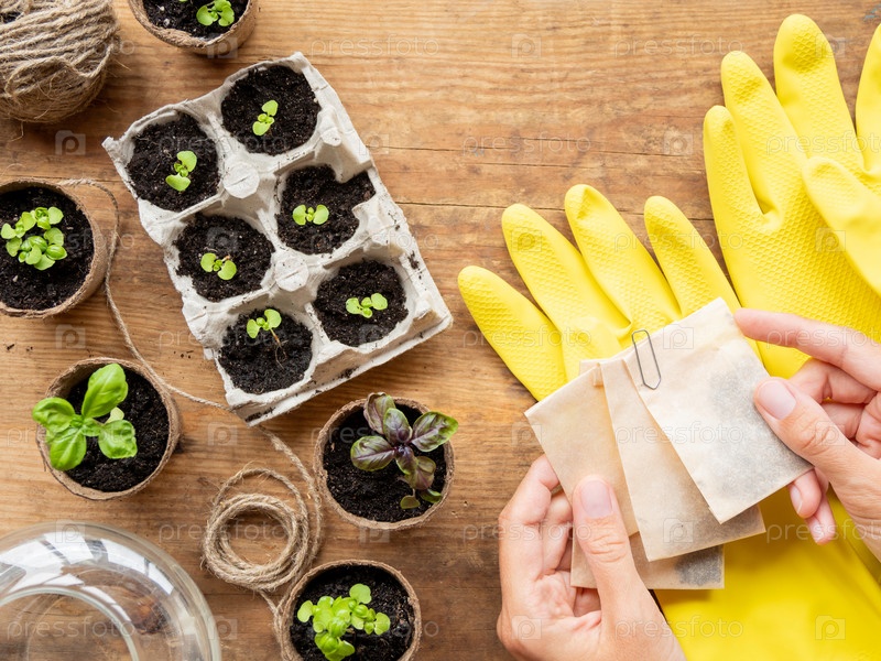 Саженцы базилика в биоразлагаемых горшках на деревянном столе. Женщина в защитных желтых резиновых перчатках держит бумажные пакеты с семенами. Вид сверху на зеленые растения в торфяных горшках и сельскохозяйственные инструменты