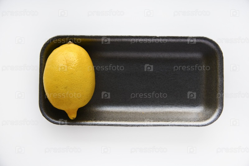 Спелые желтые лимоны на черной пластиковой подложке. Вкусные лимоны из магазина на белом фоне. Желтые лимоны упакованы в контейнер