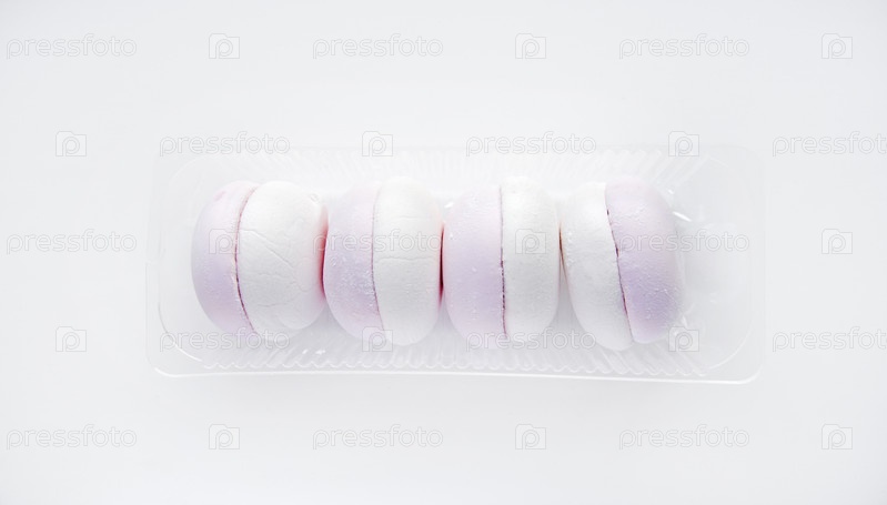 Белые и розовые зефиры на белом фоне. Зефир в пластиковой упаковке. Сладкая закуска