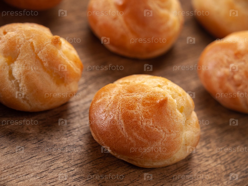 Закройте домашние профитроли на деревянной тарелке. Горизонтальный. Выборочный фокус