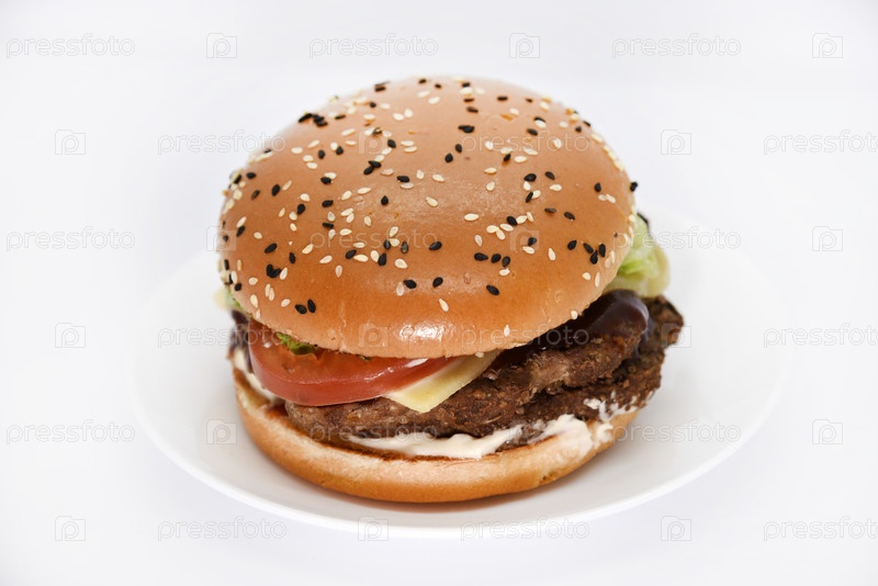 Двойной мясной бургер с овощами на белом фоне. Вкусный чизбургер на тарелке. Мясной фаст-фуд. Большой гамбургер с двойной котлетой