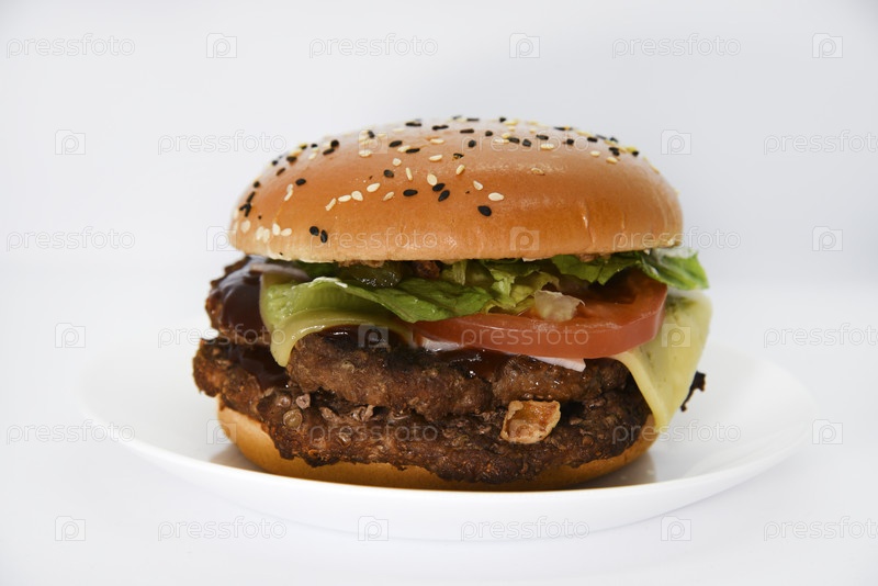 Двойной мясной бургер с овощами на белом фоне. Вкусный чизбургер на тарелке. Мясной фаст-фуд. Большой гамбургер с двойной котлетой