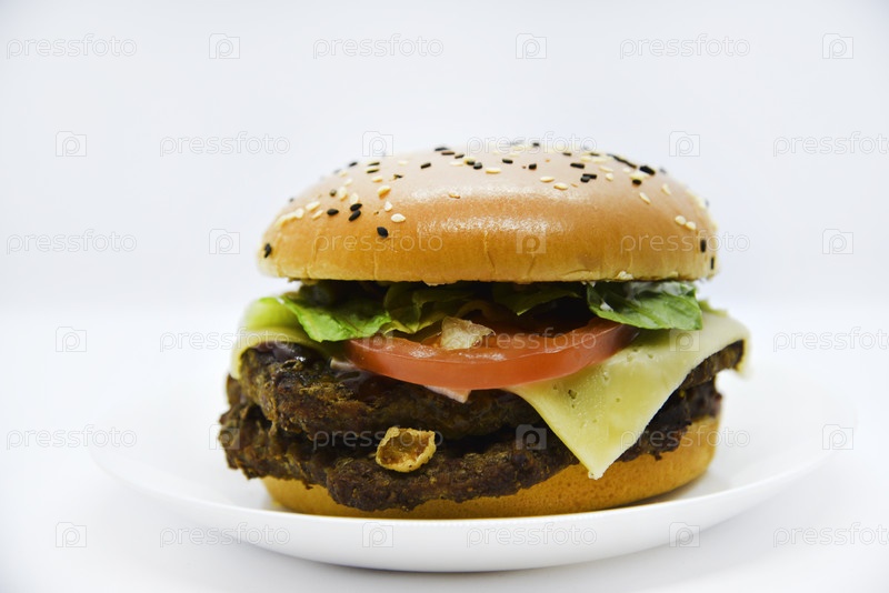 Двойной мясной бургер с овощами на белом фоне. Вкусный чизбургер на тарелке. Мясной фаст-фуд. Большой гамбургер с двойной котлетой