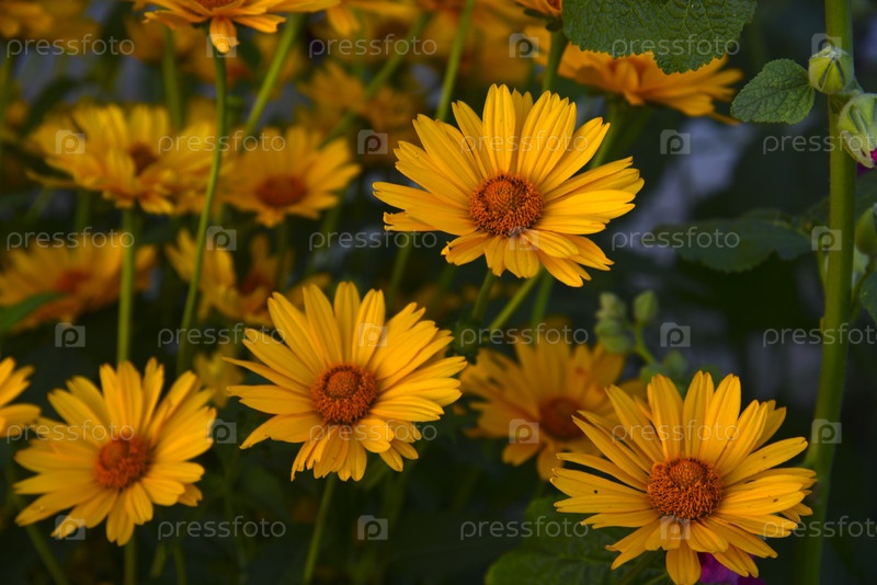 Желтые ромашки летним вечером. Красивые желтые цветы. Астровые