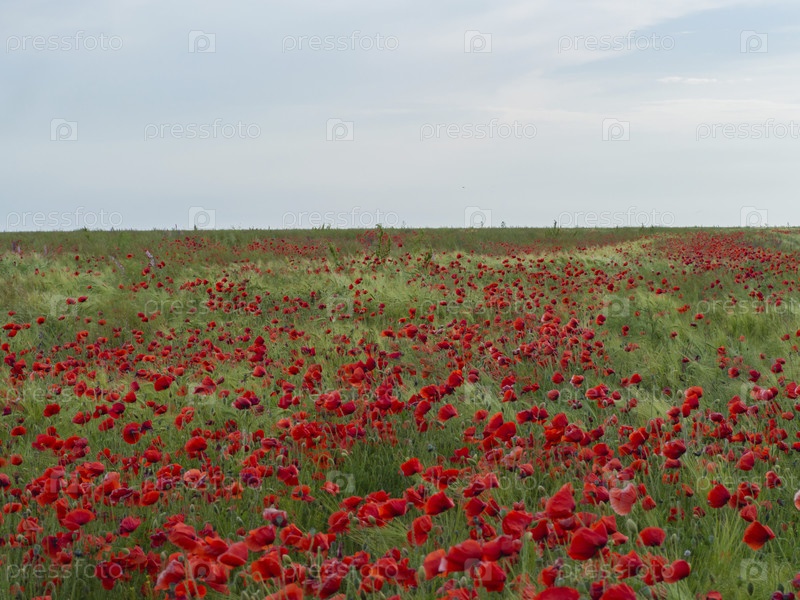 Красивое поле диких красных маков в цвету. Живописные природные ландшафты. Зеленое зерновое поле с множеством красных цветов мака на фоне голубого неба с облаками