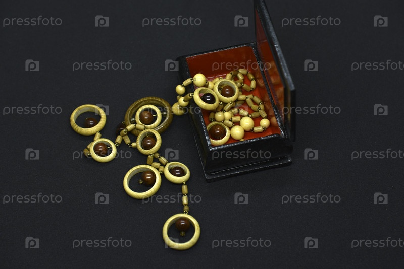 Украшение деревянными бусинами на черном фоне. Деревянные украшения в шкатулке