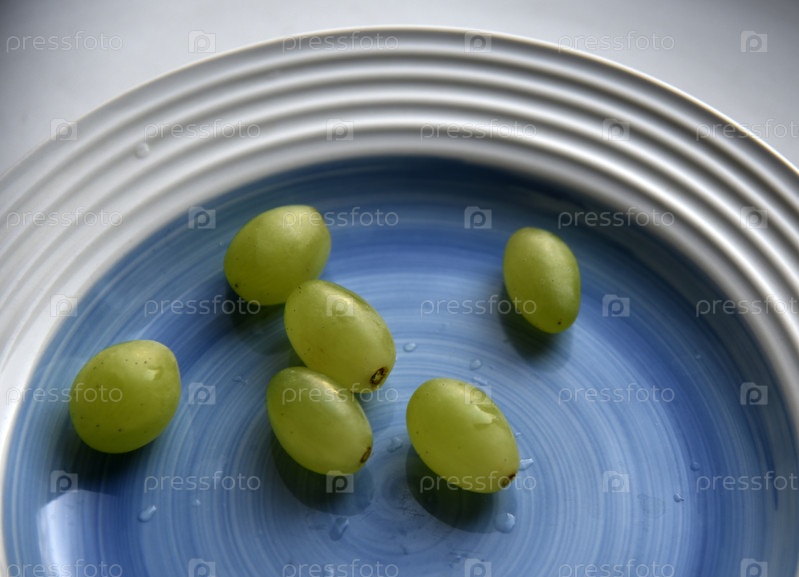 Зеленые плоды винограда на синей тарелке. Индивидуальный виноград