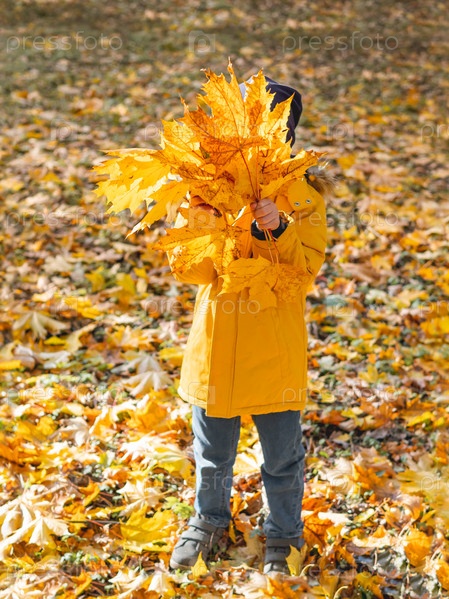 Маленький мальчик прячется за букетом ярко-желтых кленовых листьев. Осеннее веселье с опавшими листьями в парке. Активный отдых на свежем воздухе