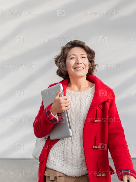 Кудрявая женщина в красном пальто стоит у белой стены. Улыбающийся взрослый студент с ноутбуком. Фрилансер с портативным устройством для работы. Современный образ жизни