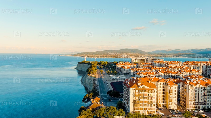 Геленджик, Россия. Маяк на берегу мыса Толстого. Геленджикская бухта, вид с воздуха