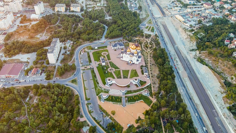 Геленджик, Россия. Собор Андрея Первозванного. Время заката, Вид с воздуха