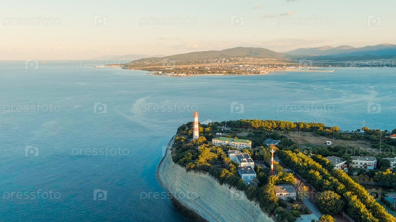 Геленджик, Россия. Маяк на берегу мыса Толстого. Геленджикская бухта, вид с воздуха