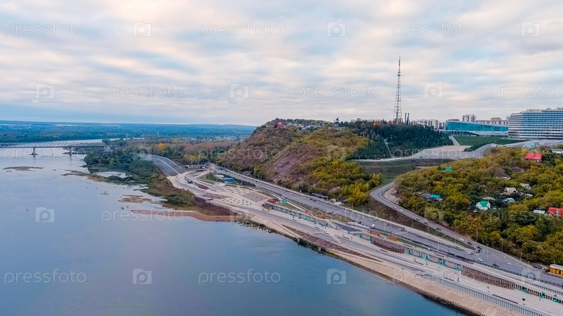 Уфа, Россия. Сквер имени Салавата Юлаева. Набережная реки Белой. Центральная часть города, вид с воздуха