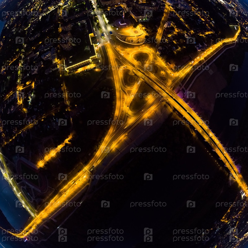 Калуга, Россия. Гагаринская развязка. Гагаринский мост. Ночной город. С высоты птичьего полета