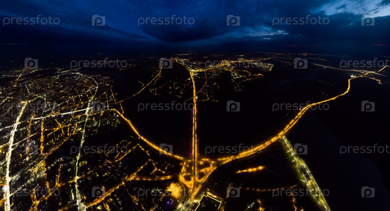Калуга, Россия. Гагаринская развязка. Гагаринский мост. Ночной город. С высоты птичьего полета
