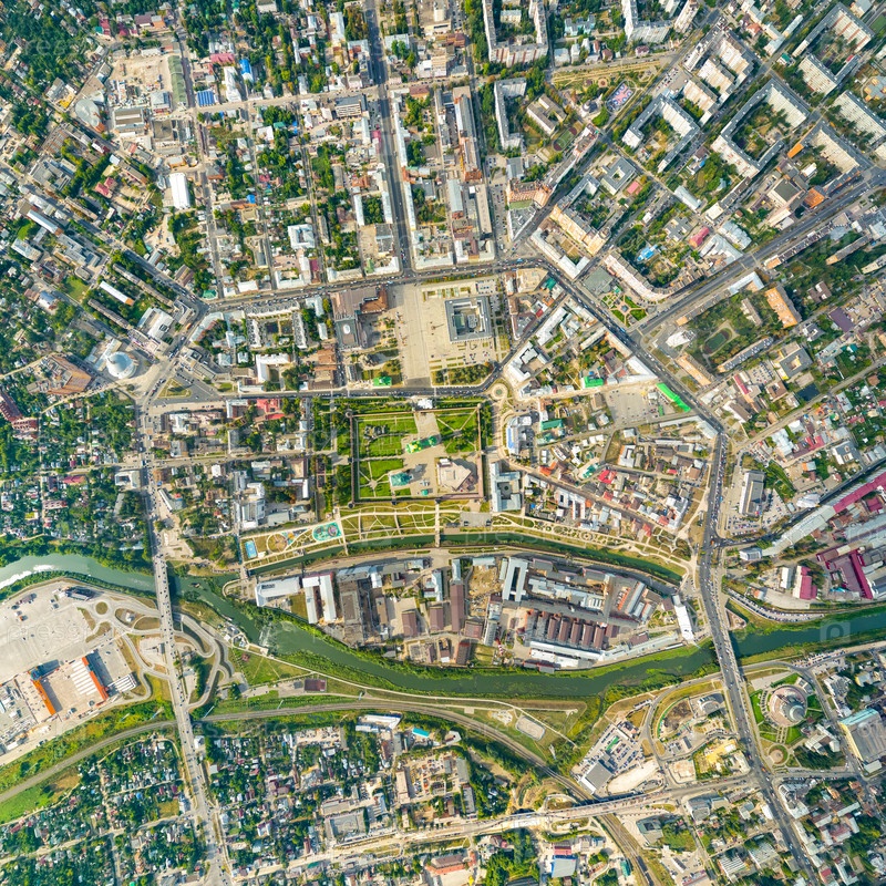 Тула, Россия. Исторический центр с Кремлем. Панорама города. Летом. С высоты птичьего полета