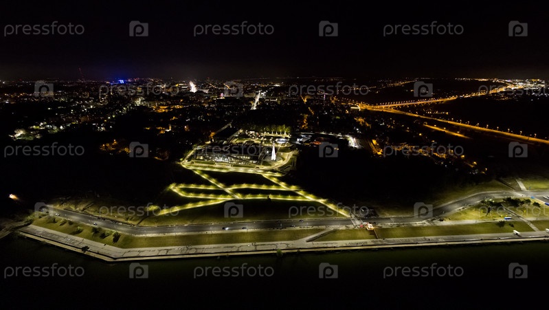 Калуга, Россия. Космическая ракета. Набережная Яченского водохранилища. Вид с воздуха ночью