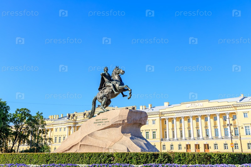 Санкт-Петербург, Россия.Памятник Петру I на Сеннатской площади.Текст переведен на английский язык - Петр Великий Екатерина Вторая Год 1782