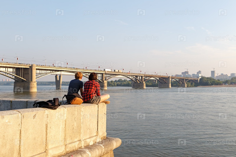 Россия, Новосибирск. Парень и девушка сидят на каменных перилах и смотрят на реку Обь