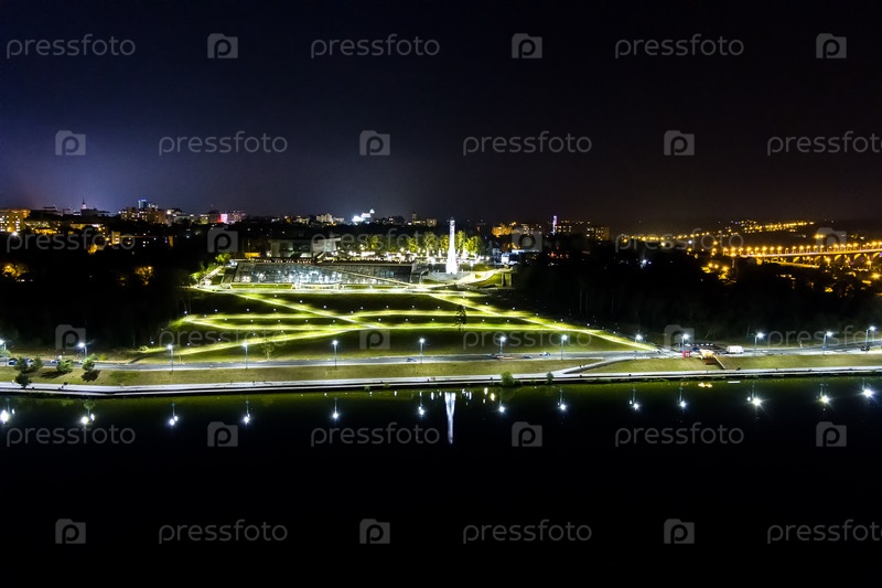 Калуга, Россия. Космическая ракета. Набережная Яченского водохранилища. Вид с воздуха ночью