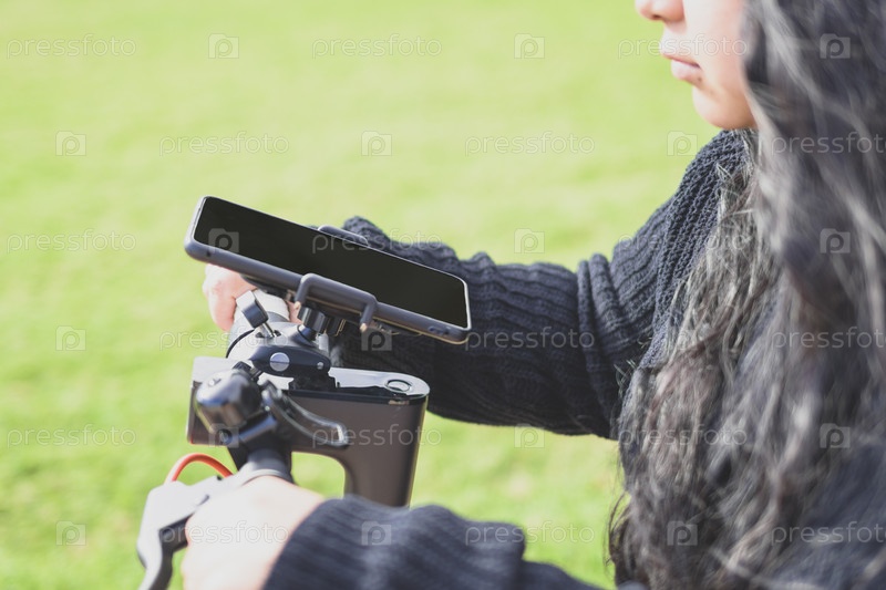 Молодая латиноамериканка, катающаяся на электрическом скутере и использующая приложение для смартфона