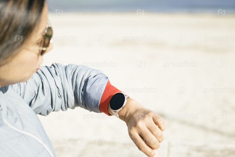 Закрытый вид сбоку, латиноамериканка в солнечных очках смотрит на умные часы, светлый фон