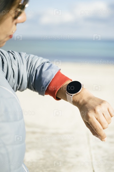Умные часы. Умные часы в руке женщины на улице. Привлекательная молодая элегантная женщина с умными часами. Латиноамериканка в своих носимых умных часах и улыбается