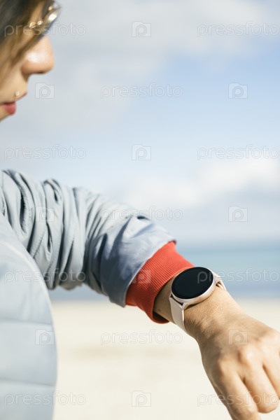 Снимок талии счастливой брюнетки, одетой в куртку, проверяет результаты фитнеса на умных часах, позирующих на фоне пляжа на побережье. Здоровый образ жизни