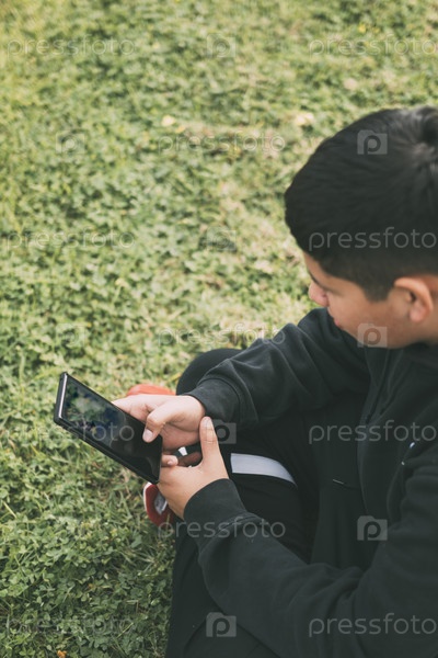 Вид сверху молодой тысячелетний мальчик сидит в парке, в зеленой траве Скатча в черной повседневной одежде, смотрит на свой смартфон, избирательный фокус, концепция технологии