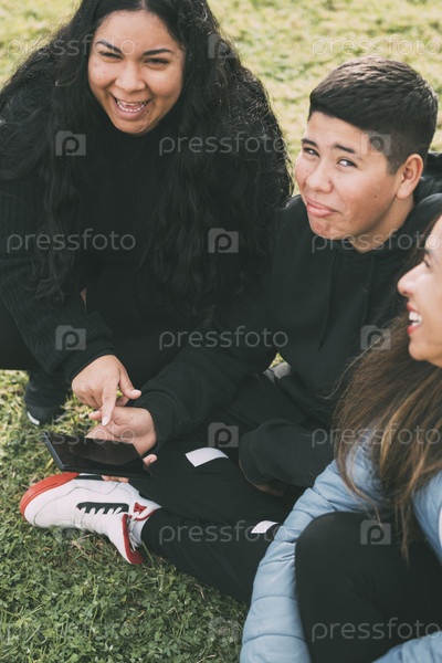 Красивая латинская семья смеется от просмотра видео на смартфоне, сидят в зеленом парке два брата и мать в солнечный день