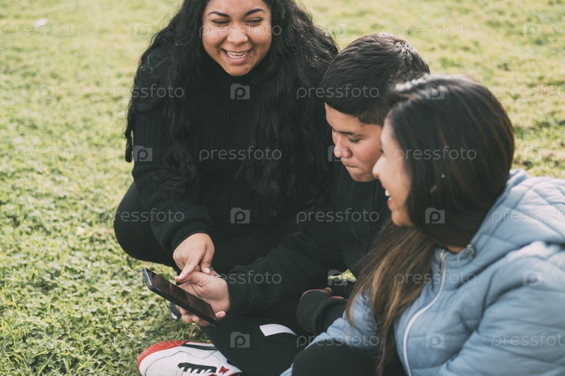 Красивая латинская семья смеется от просмотра видео на смартфоне, сидят в зеленом парке два брата и мать в солнечный день