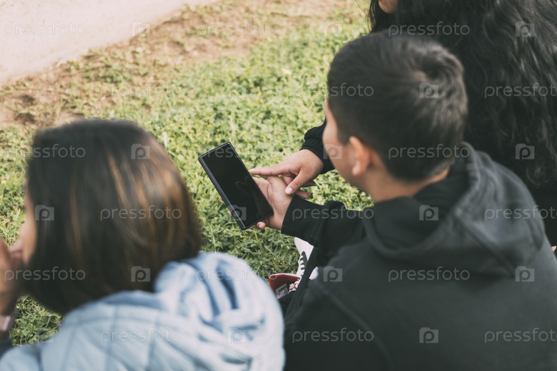 Красивая латинская семья смеется от просмотра видео на смартфоне, сидят в зеленом парке два брата и мать в солнечный день