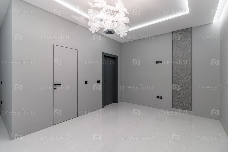 Простая современная серая стена с черно-серой дверью в пустой комнате. Элемент дизайна интерьера современного дизайна интерьера в современном доме