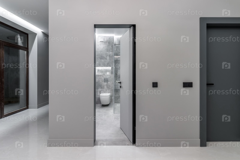 Простая современная серая стена с черно-серой дверью в пустой комнате. Элемент дизайна интерьера современного дизайна интерьера в современном доме